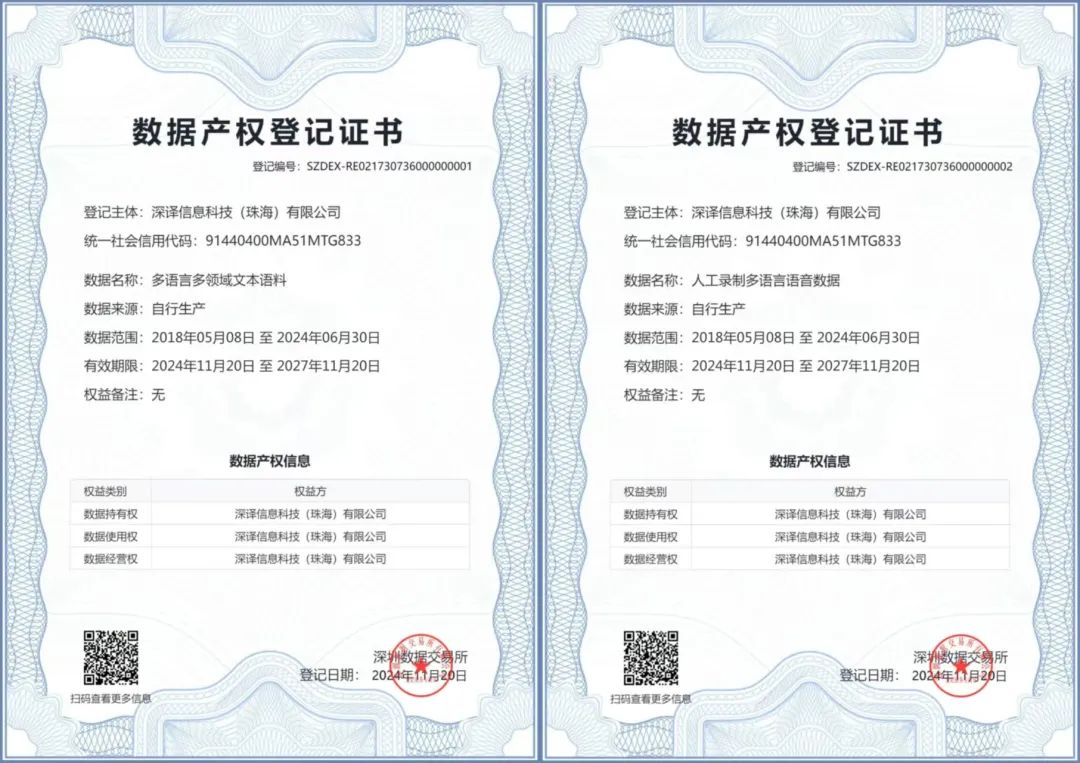 近日,来自珠海市香洲区的深译信息科技(珠海)有限公司(以下简称“深译科技”)高质量数据集完成了在深圳数据交易所的数据产权登记,获深圳数据交易所首次颁发的数据产权登记证书。 数据产权登记证书作为登记申请人拥有数据产权的可信依据,可作为开展或参与数据流通交易、数据资产入表、数据融资担保、数据信托、争议解…